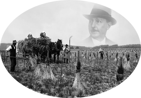 Historische Grünlandarbeit in Steinach und Firmengründer Dr. Karl August von Schmieder. 1920 begann hier die systematische Futterpflanzenzüchtung. (Quelle: SZS)